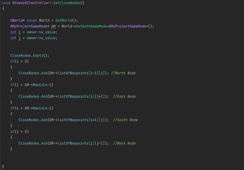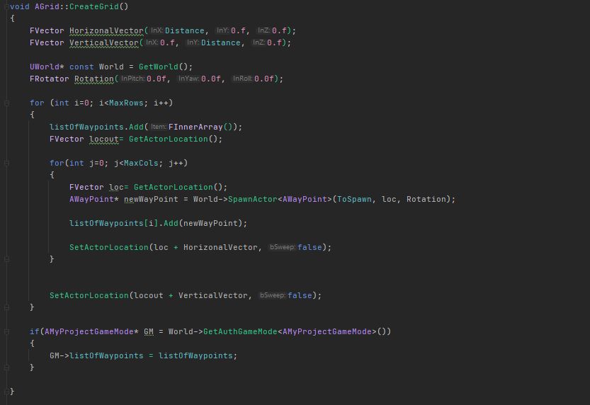 The grid is created by a special actor that generates waypoints and stores them in a custom struct so that they can be easily accessed later on. For debug or testing purposes the grid can be tested in the editor, all the initial variables of the grid can be easily modified.